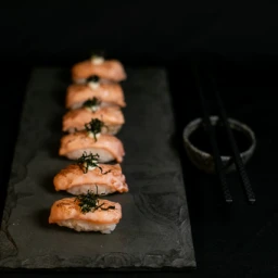 2 unidades (bolinho de arroz (oniguiri) prensado com uma fatia de salmão maçaricado por cima)