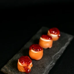 2 unidades de joy (bolinha de arroz envolto de salmão e creamcheese, com geleia em cima)