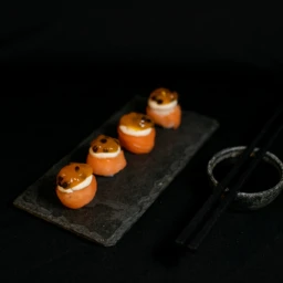 2 unidades de joy (bolinha de arroz envolto de salmão e creamcheese, com geleia em cima)