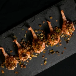 Peça autoral da nossa chefe. Camarão cozido recheado com tartare de salmão com crispy de alho poró. INCRÍVEL !!