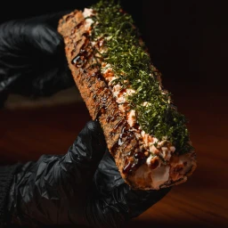 BIG HOT RECHEADO COM SALMÃO E CREAM CHEESE, FINALIZADO COM CUBOS DE SALMÃO , TERIAKY E ALHO PORÓ