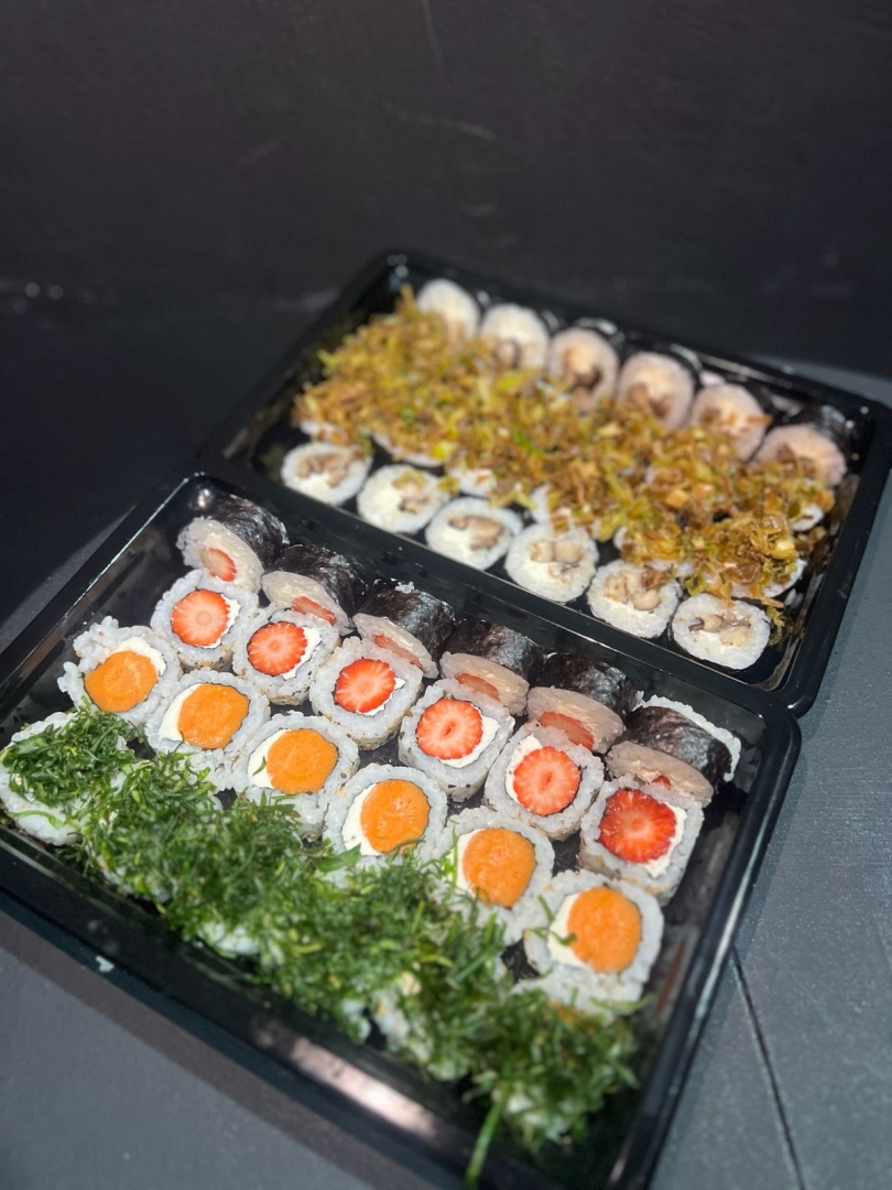 6 hossomaki de morango + 6 uramaki de morango + 12 hossomaki de brocolis com alho poró + 6 uramaki cenoura + 6 uramaki de cenoura com crisp de couve + 12 hossomaki de shitake. Acompanha 2 hashis, shoyu e teriaky proporcional ao tamanho do combo.