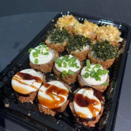 3 unidades hot de salmão com crisp de alho poró + 3 unidades hot de salmão com crisp de couve + 3 unidades hot de salmão com creamcheese + 3 unidades hot de salmão com creamcheese com teriaky.