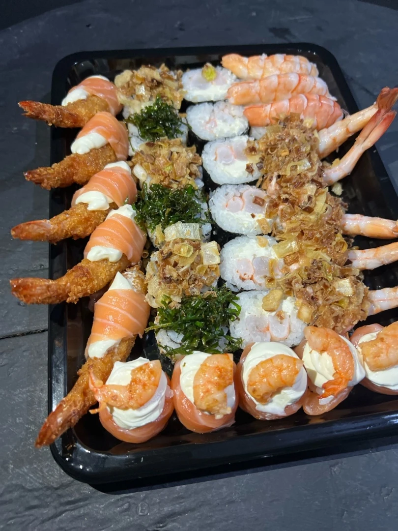 3 niguiris camarão + 5 joy camarão + 6 hossomaki camarão + 6 uramaki camarão especial (com crisp de couve e alho poró)+ 5 caminhas de camarão + 5 camarão ice.