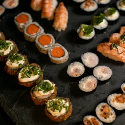 10 haruhot salmão + 5 hot salmão tradicional + 5 hot salmão com crisp de alho poró + 5 hot salmão com crisp de couve + 5 hot salmão com cream cheese e cebolinha